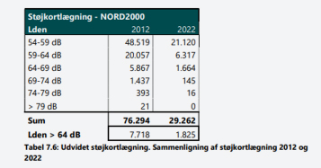 Banedanmarks støjkortlægning viser, at der langs samtlige af Banedanmarks jernbanestrækninger er cirka 1.825 boliger svarende til 2.458 personer, der er udsat for støj over grænseværdien. Det er væsentlig færre, end de 4.691 boliger i 2017 og 7.718 boliger i 2021, der var belastet med støj fra jernbaner over Miljøstyrelsens vejledende grænseværdi på 64 dB.